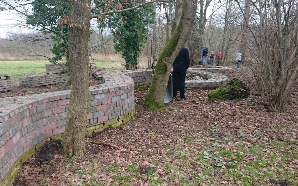 Buiten proeven we de sfeer van een nog kaal landschap verbonden met het prachtige beekdal de RuitenAa. Juist door de de kaalheid van de wintermaand valt de slingermuur op welke zijn weg lijkt te zoeken in de bebossing.. Het doet denken aan de historie van slingerende muren die er in Groningen en Friesland bij de Borgen en landgoederen staan. Een slingermuur waar tegen fruitbomen werden geplant, welke zorgden voor een grote opbrengst omdat de muur warmte vasthield als de zon warmte leverde. Maar ook denkend aan de kunstenaar en tuinarchitect Louis Leroy, welke afgedankte stenen van allerlei soorten en maten tot bouwwerken stapelde. Bouwwerken waar de natuur zijn gang gaat en tot een eenheid vormt. Inwoners van Wessinghuizen zijn deze slingerende muur aan het opbouwen. Het maakt een mooie verbinding met de meanderende beek in het achterland. De muur is opgebouwd door enkele dorpbewoners en dat is juist wat Kok en Westra voor ogen hadden, kunst en filosofie en de verbinding met het landschap, het dorp en zijn inwoners.
