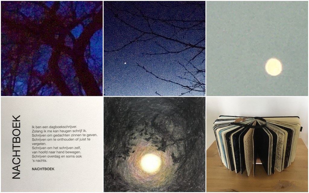 Een half jaar werkte kunstenaar Marijk Gerritsma aan dit ‘Nachtboek.’ Ze schreef, fotografeerde, maakte nachtelijke uitstapjes, tekende, dwaalde rond op internet en vond al lezend mooie zinnen over de nacht, het duister en de schemer.Alle ervaringen gaf ze een plek in een boekje van slechts 12 x 12 cm, het was uiteindelijk zo dik dat het als een waaier openstond. Steeds bracht de nacht Marijk bijzondere momenten. Af en toe kwam ze haar nachtboek tijdens de tentoonstelling even aanvullen.