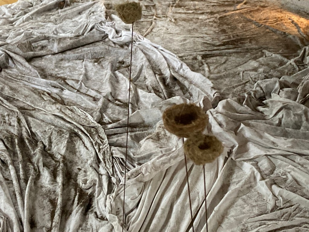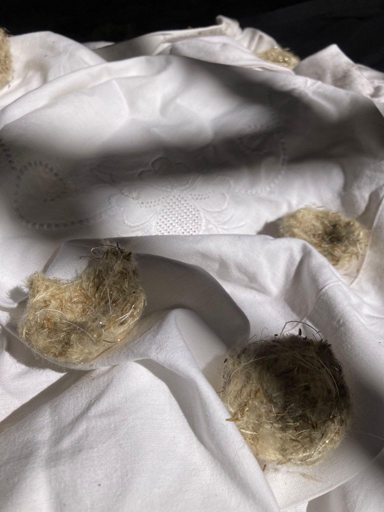 plastic onder de lakens is niet meer nodig en de lakens worden opnieuw geschikt. De pluizen nesten staan te wiebelen op de sokkels, sommige buigen tot bijna een halve meter van de grond.