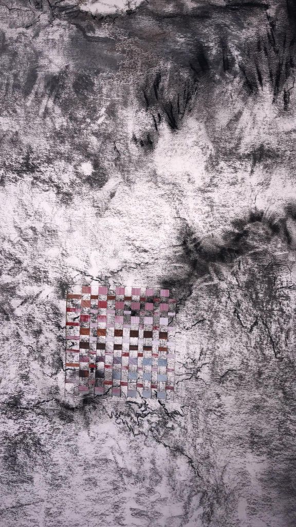 | Tekening, houtskool 75×100 cm | Detail, tekening houtskool, conte met weefwerk 100×150 cm |