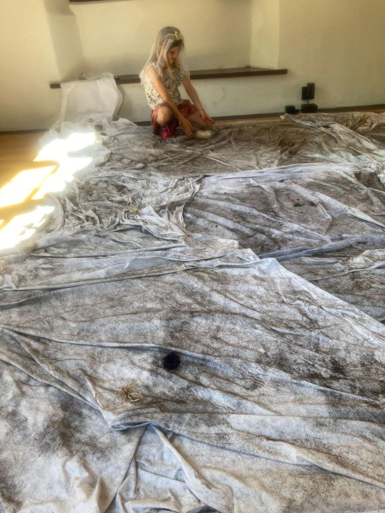 Wilma Drooger: Work in progress: Installatie, lakens, aarde, gerafelde dradeen, paardenbloempluis.