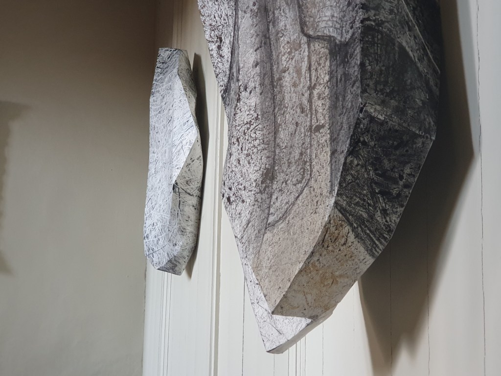 De hemellichamen zijn sculpturen gemaakt van tekeningen, houtskool en inkt op papier.