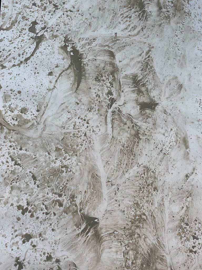 3.50 meter papier, neergelegd op de aflopende helling van terpen/wierden. Waar het Wadden klei en zeewater vrij spel krijgt. Er ontstaan patronen van de beweging van terugtrekkend water in de klei, het hoge water eindigt in het lage water. Denkend aan de onrust in vroegere tijden bij hoog water, een geschiedenis van lang geleden welke plotseling in deze tijd weer actueel is. De klimaatverandering, het stijgen van het zeewater, overstromingen zijn niet zover bij ons vandaan. De geschiedenis herhaalt zich en dijken zullen steeds meer verzwaard of verhoogd worden. De ontstane tekeningen, wachten op laag water vertellen het verhaal uit lang vervlogen tijden…….of toch niet.