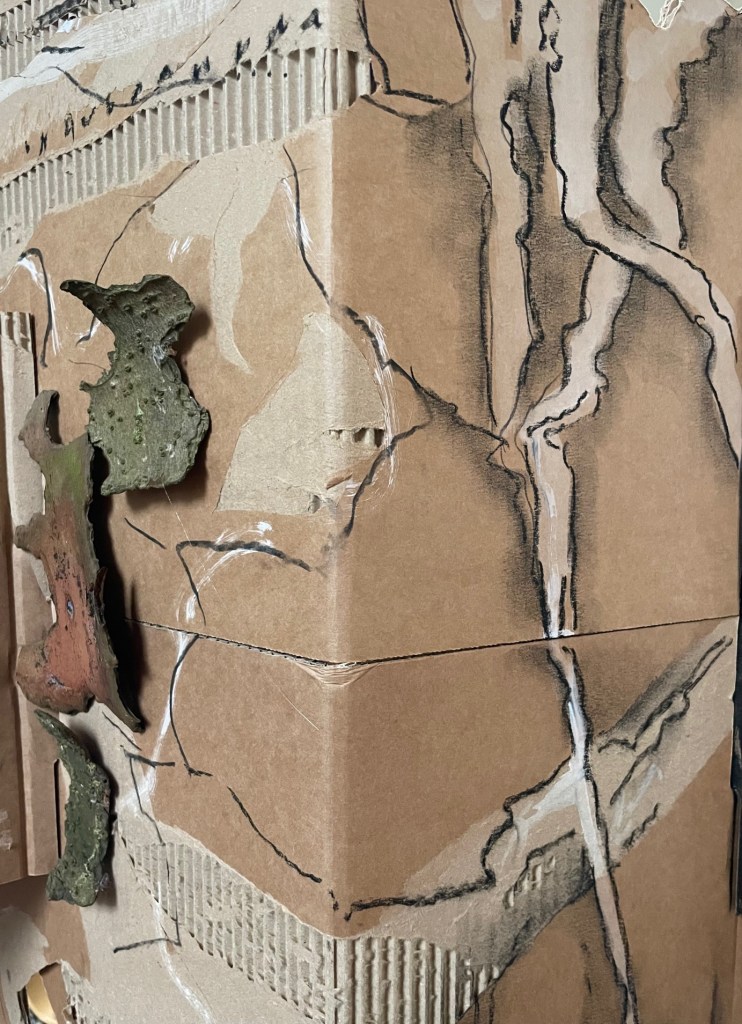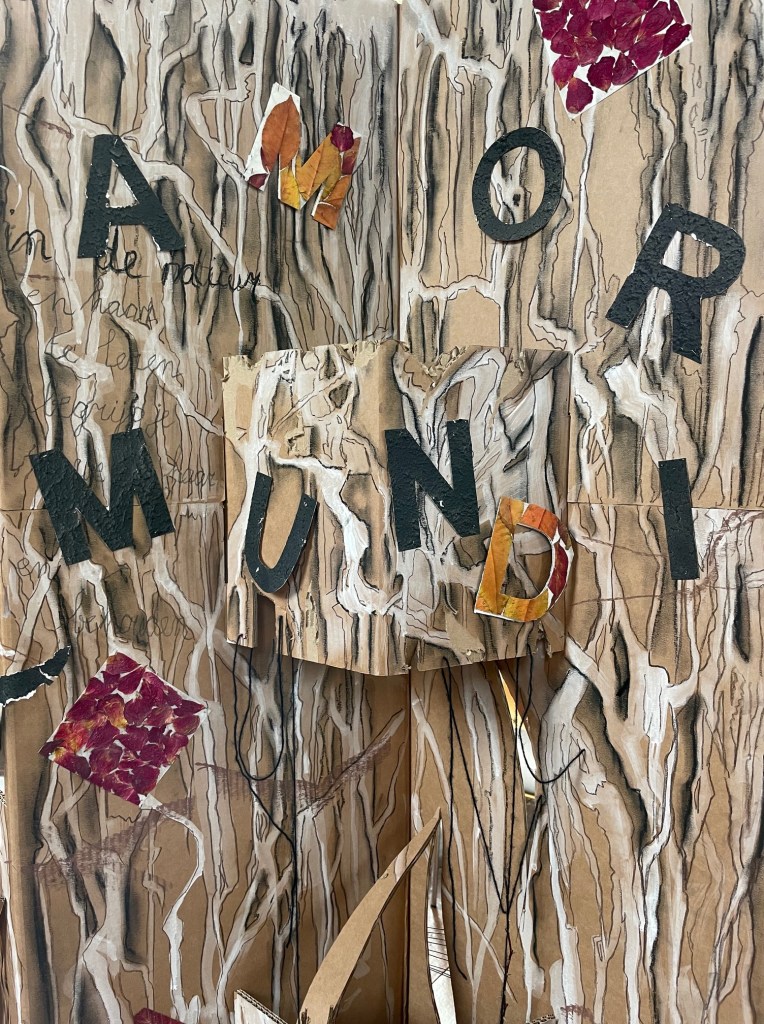 Mijn bijdrage hieraan: Amor Mundi – liefde voor de wereld ( Hannah Arendt ). Hier haal ik mijn inspiratie uit. Door de natuur te beleven en haar beter te leren kennen begrijp je waarom je haar moet koesteren en beschermen. Ik verbeeldt deze kwetsbaarheid door organische vormen te tekenen. Lijnen en vormen die inmiddels door alle bijdragen heen lopen.