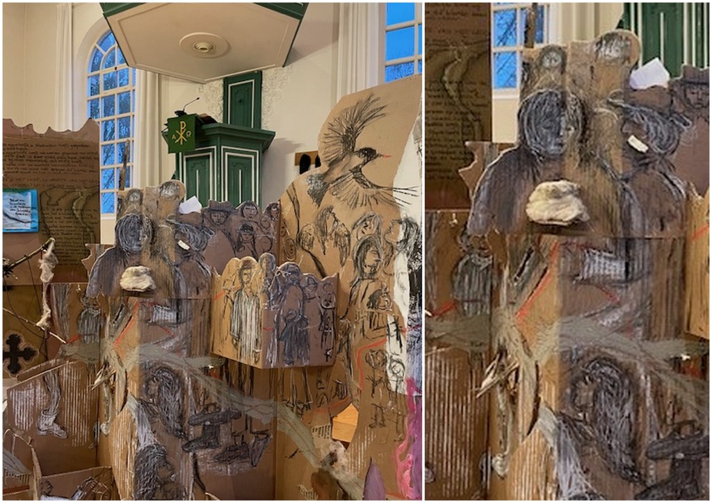 Wilma Drooger liet zich beïnvloeden door de tekst ‘Bewaar het land ‘en tekende met houtskool en krijt op het karton. Steeds meer getekende lijnen vormden een stoet , kleine en grote figuren. De vrouw met een klein nest in haar armen lijkt de aanvoerster te zijn. Een vreedzame protestmars .